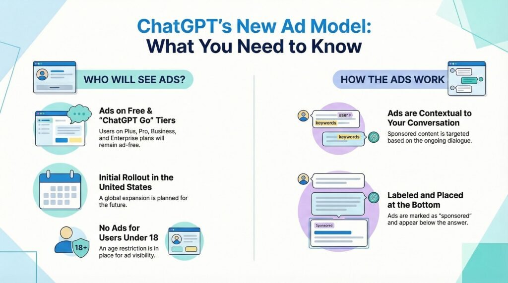 Currently, ChatGPT ads are not visible to every user. The initial testing phase is geographically limited to the United States and is strictly for Free and Go users. Crucially, OpenAI has drawn a hard line on user experience: paid subscriptions (Plus, Pro, Team, and Enterprise) will remain entirely ad-free. For marketers and businesses, this signals the dawn of “Conversational Advertising” a new frontier where brand visibility is driven not just by keywords, but by intent and conversational context.