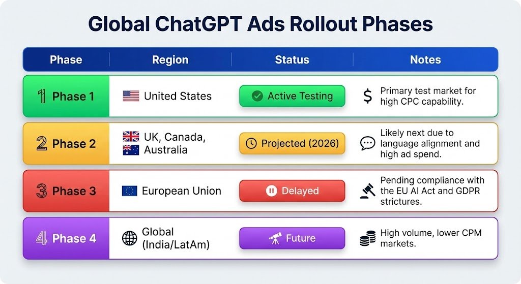 | Phase 2 | UK, Canada, Australia | Projected (2026) | Likely next due to language alignment and high ad spend. |